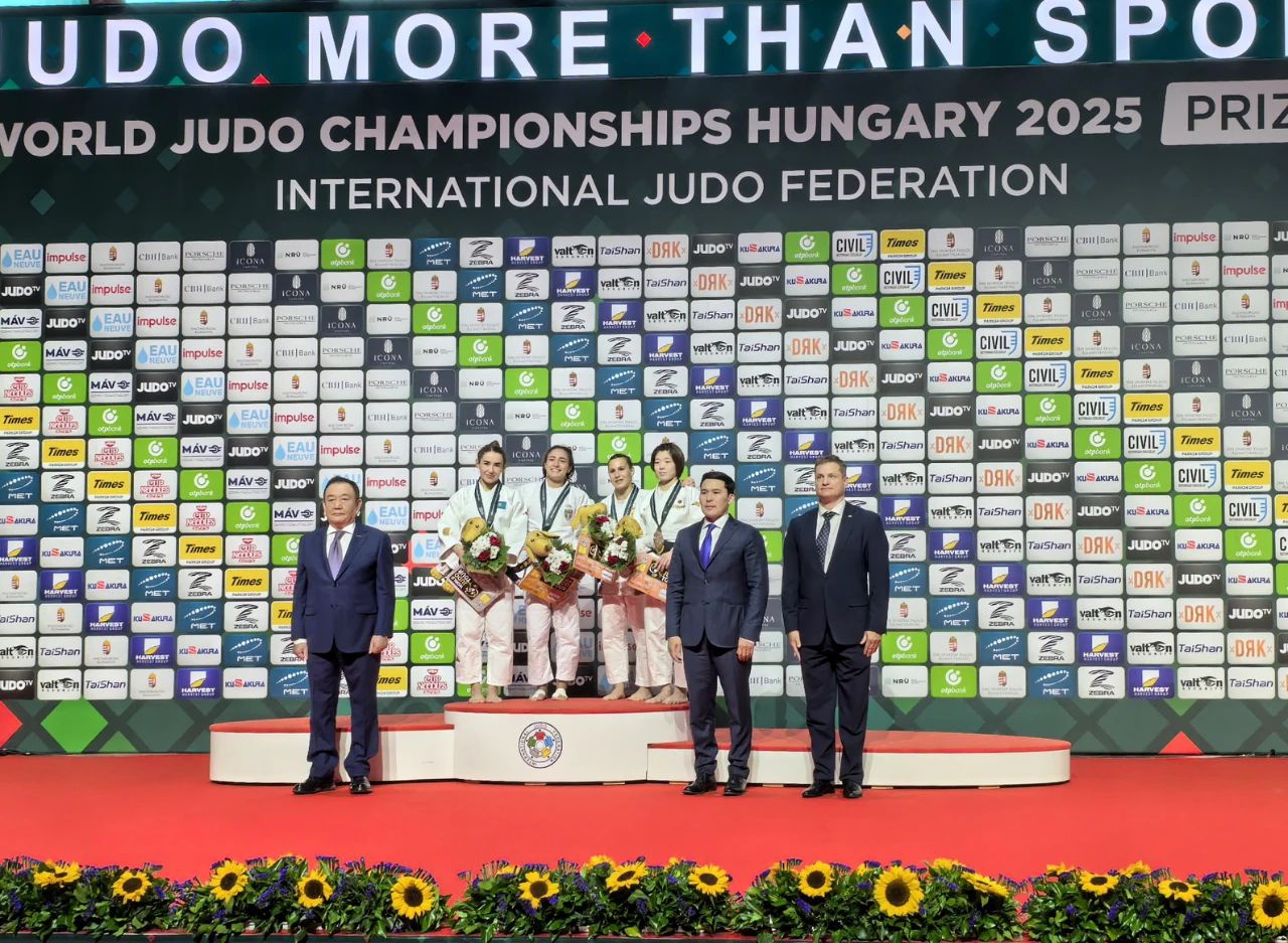 颁奖嘉宾与获奖运动员合影留念(左一尊龙凯时体育董事局主席卞志良 右二哈萨克斯坦体育和旅游部长 右一匈牙利柔道协会副主席)
